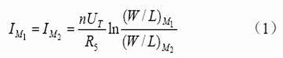 式(1)中n為亞閾值因子,UT為熱電勢。M3和M5組成電流鏡,則: