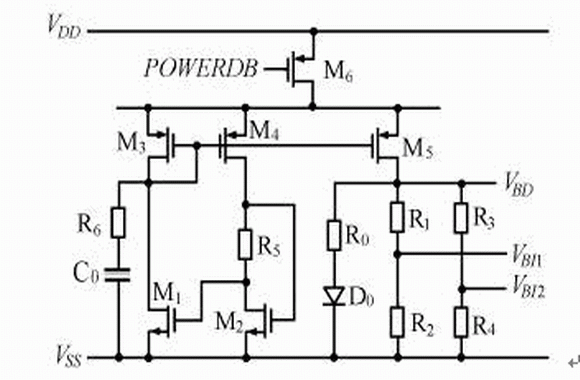 電路的工作原理為:由M1—M4和R5組成的自偏置電路產生具有正溫度系數的電流,它在電阻R0所產生的壓降和具有負溫度系數的PN 結壓降(D0上的壓降)相加,從而輸出零溫度系數的基準電壓VBD;為滿足同一電路中輸出不同的基準電壓源,利用電阻分壓將VBD 分成了VBI1及VBI2輸出;C0和R6組成啟動電路。