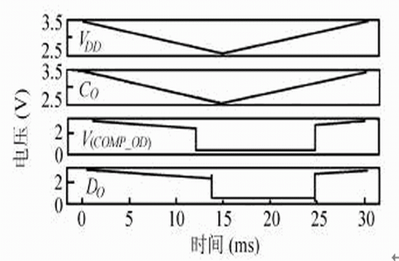 芯片的所有功能和主要參數均用HSPICE 進行了模擬驗證。圖8 給出了過充電保護檢測和釋放波形圖,圖9 給出了過放電保護檢測和釋放波形圖,其中COMP_OC 為過充電比較器的輸出信號,COMP_OD 為過放電比較器的輸出信號;芯片的過充電和過放電檢測精度約為30mV,在正常工作時消耗的電流為3.23uA,在待機狀態時消耗的電流為0.15uA。