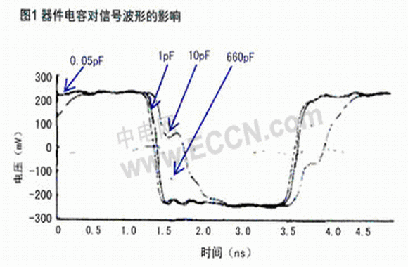 傳輸速率為12Mbps時(shí),其保持電平的時(shí)間要長得多(80ns)。在此數(shù)據(jù)傳輸率條件下,10pF或更小的電容值將使得數(shù)據(jù)通過時(shí)的失真最小。當(dāng)傳輸速率提高到480Mbps時(shí),信號(hào)具有短得多的電平保持時(shí)間(2.0ns)。此時(shí)10pF電容的ESD抑制器件已經(jīng)引起波形失真:它減少了電平保持時(shí)間并使前沿和后沿的形狀大為改變。而660 pF電容的ESD抑制器件則造成了相當(dāng)大的失真,以致于波形甚至無法達(dá)到信號(hào)工作電壓。圖1顯示了不同ESD抑制器件對(duì)480Mbps數(shù)據(jù)波形的影響。