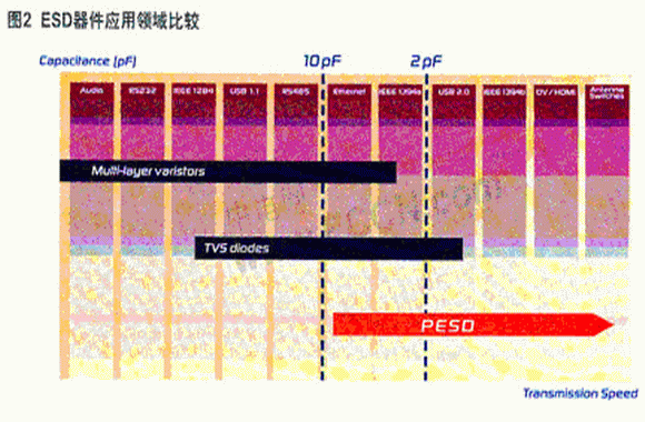 低電容ESD保護(hù)對(duì)于高速條件下保持?jǐn)?shù)據(jù)的完整性是非常關(guān)鍵的。在常見的瞬間過電壓抑制器件中,金屬氧化物壓敏電阻(MOV)和多層壓敏電阻(MLV)因價(jià)廉物美而應(yīng)用廣泛。但其固有的高電容決定了其應(yīng)用范圍只能局限于低頻領(lǐng)域和電源的瞬間電壓抑制上。而硅類ESD防護(hù)器件,包括齊納二極管、TVS二極管/陣列等,雖然具有保護(hù)電壓低而準(zhǔn)確的優(yōu)點(diǎn),其寄生電容依舊不可忽視,通常難以適用于高速數(shù)據(jù)通訊接口,如HDMI、IEEE1394等。