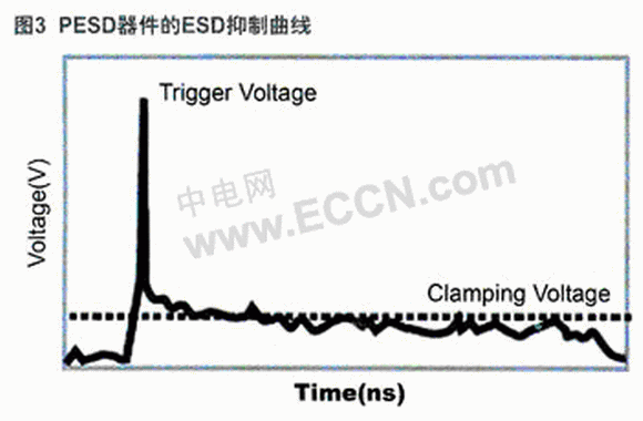 為滿足高速數(shù)據(jù)通訊接口既ESD保護(hù)有效、又不影響高速信號(hào)傳輸?shù)囊蟆=陙恚袌錾贤瞥隽硕喾N專門適用于此類保護(hù)要求的器件。其中以瑞侃電路保護(hù)部門(RCP:RaychemCircuit Protection)推出的PESD器件為代表。該器件的電容極低(通常0.25pF),漏電流極小(<0.001 A);ESD防護(hù)快速有效(響應(yīng)曲線如圖3所示,觸發(fā)電壓典型值為150~250V;響應(yīng)時(shí)間少于1 ns);價(jià)格低于低電容硅器件。因此,在高速數(shù)據(jù)傳輸條件下,PESD器件擁有更佳的保護(hù)應(yīng)用特性。該器件已成功應(yīng)用于HDMI1.3和USB2.0等多種高速接口電路。
