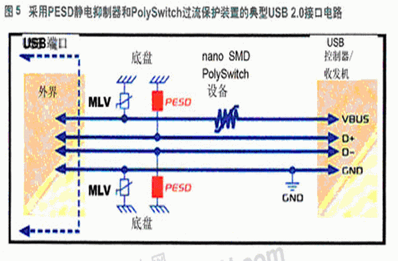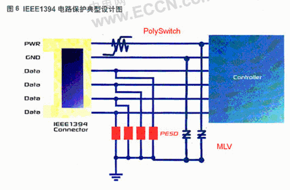 圖4、圖5和圖6展示了利用瑞侃電路保護(hù)部門PESD器件對(duì)HDMI1.3、USB2.0和IEEE1394接口電路進(jìn)行保護(hù)的典型應(yīng)用。這些保護(hù)將ESD與敏感電路隔離。在傳輸線路脈沖(TLP) 測試和IEC61000-4-2測試中,尤其是經(jīng)過多次采樣(1000次TLP測試)后,其性能要比其他可比較的元件好。相對(duì)于其他典型的聚合物ESD防護(hù)器件,這類PESD器件的較低觸發(fā)電壓(通常150V)和低箝位電壓(通常25V)能更好的幫助保護(hù)敏感電子元件。該器件采用電子工業(yè)中最流行的0603和0402貼裝形式,符合RoHS的嚴(yán)格要求;幫助機(jī)頂盒敏感電路、手提電腦、手機(jī)和其它便攜式設(shè)備免ESD侵害。