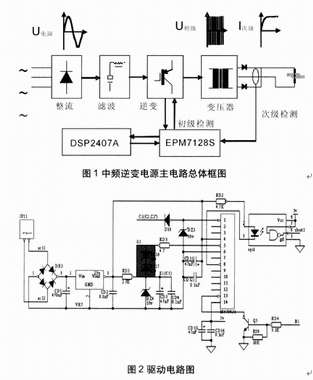 中頻逆變直流電阻焊機的供電電源是由三相工頻交流電源經整流電路和濾波電容轉換成直流電源,再經由功率開關器件組成的逆變電路轉換成中頻方波電源,然后輸入變壓器降壓后,經低管壓降的大功率二極管整流成直流電源,供給焊機的電極,對工件進行焊接(見圖1)。控制電路部分由DSP和CPLD組成,DSP(TMS320LF2407A)產生的PWM波和檢測信號、保護信號在CPLD(EPM7128S)里現實邏輯運算。