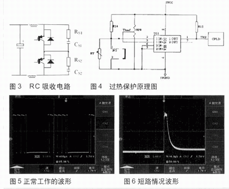 本文采用普通散熱器與強迫風冷相結合的措施,并在控制電路上加過熱檢測保護電路,應付IGBT與散熱器接觸不良或者非正常情況,在IGBT散熱片上安裝熱敏電阻,然后通過邏輯判斷電路給出信號,供控制電路處理(見圖4)。