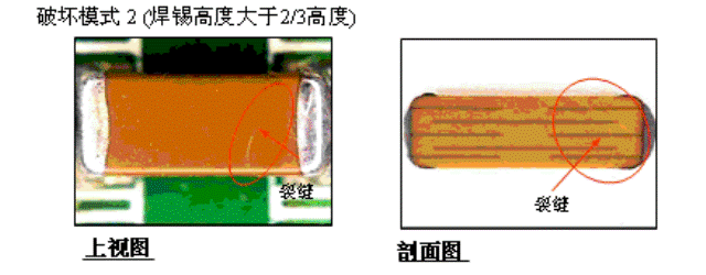 貼片式陶瓷電容的內部裂縫能引起嚴重的破壞。如果在PCB組裝過程中,貼片式陶磁電容器招受到剪應力,一種板彎裂縫將會在陶磁內部產生,這些裂縫有可能貫穿電容內部多層內部正負電極層,這樣可能導至短路的風險。典型的板彎破壞裂縫模式如下圖所示。這些短路模式可能導至電容過熱而造成嚴重的燒毀熔融現象。