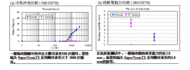 在破壞性的抗折板測試中,PCB板將持續彎曲直到貼片電容產生破壞為止,在這種模擬比較實驗中,可以發現具有柔性端頭設計的產品中,沒有在陶瓷結構中產生裂縫,而是從彈興銀層產生撕裂現象。