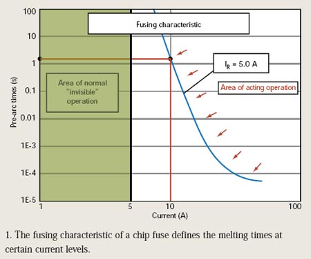 熔斷特性是芯片保險(xiǎn)絲最重要的屬性(圖1)。該特性界定了在一定電過(guò)流條件下的熔斷時(shí)間。若電流達(dá)到一定預(yù)設(shè)值,則在稱(chēng)為弧前(pre-arc)時(shí)間的一個(gè)已知期限內(nèi),熔斷元件內(nèi)耗散的電能足以把其熔化并汽化。