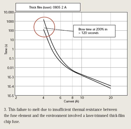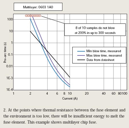 若熔斷元件和環(huán)境間的熱阻抗過(guò)低,將沒(méi)有足夠能量融化熔斷元件。這將使保險(xiǎn)絲不能在120秒內(nèi)切斷相當(dāng)于額定電流兩倍的過(guò)載電流。圖2和圖3說(shuō)明了多層片式保險(xiǎn)絲以及激光調(diào)割厚膜芯片保險(xiǎn)絲的這種情況。