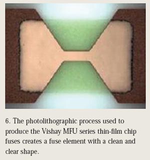 采用光刻技術(shù),可以與控制濺射薄膜層厚度相同的準(zhǔn)確度和精度對(duì)熔斷元件的長(zhǎng)度和寬度施加控制。圖6顯示了如何采用光刻工藝制造Vishay的MFU系列薄膜芯片保險(xiǎn)絲,制成的熔斷元件具有整潔和清晰的形狀。
