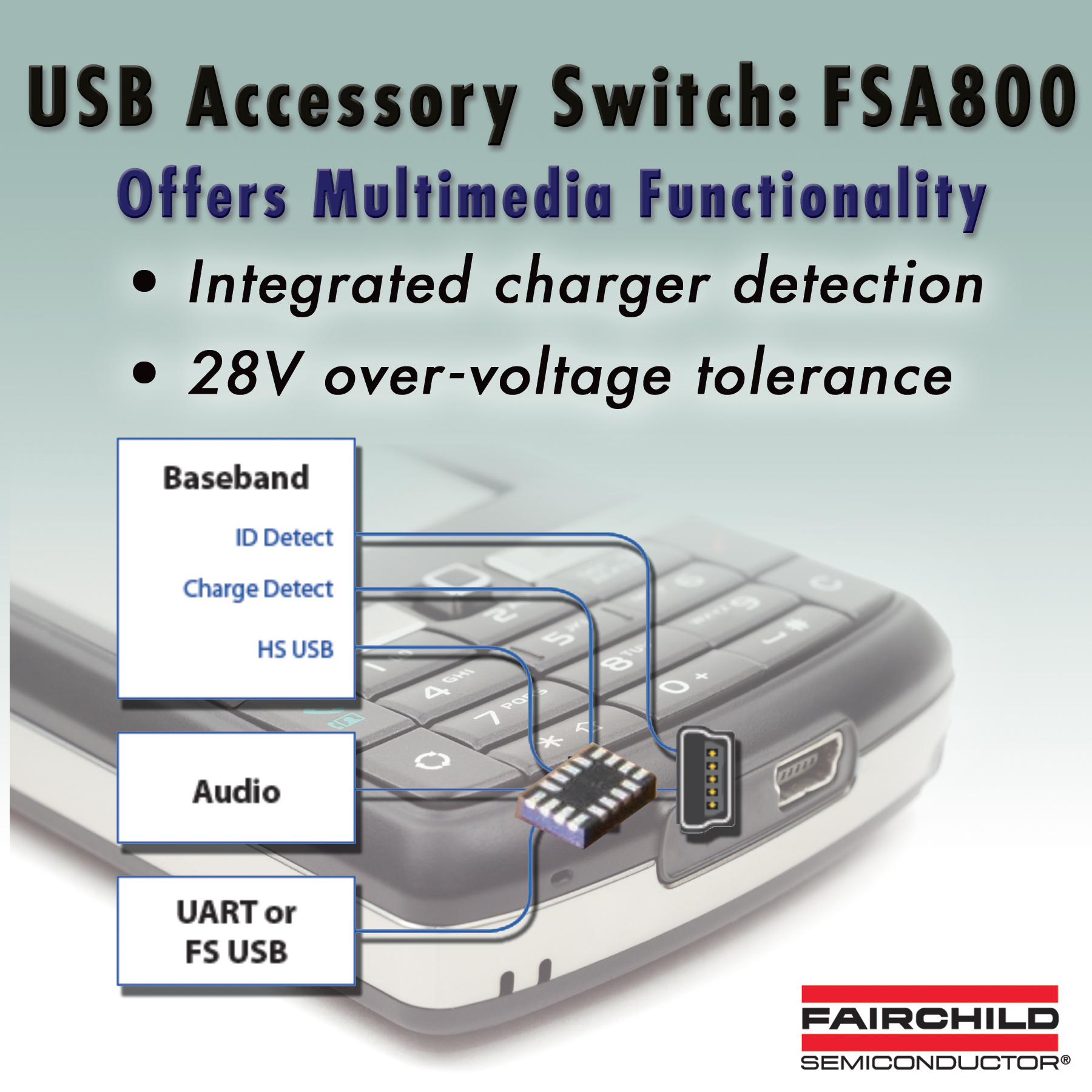 飛兆半導體公司 (Fairchild Semiconductor)為手機、PDA和MP3播放器設計人員提供全新USB附件開關產品FSA800。FSA800是業界最小的器件,將所有主要的多媒體功能集成進薄型UMLP封裝(1.8mm x 2.6mm x 0.55mm)中。它具有內置充電檢測功能、28V的過壓容差、內置終止電阻器,以及負擺幅功能。通過在緊湊型封裝中集成了多種功能,可以簡化便攜設計并減少外部元件數目。