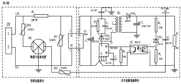 陶瓷氣體放電管的通流容量根據(jù)要求的通流容量選擇,電路采用3RM470L-7.5-L,通流量為5000A。線繞電阻R1起限流分壓作用;貼片整流模塊為開關(guān)電源電路前端整流作用,C1為高壓濾波電容,Y1為去耦電容,電阻R2和電容C2及VD2組成開關(guān)電源芯片MOS管的吸收鉗位電路,保護(hù)芯片,開關(guān)電源芯片采用PI公司的TNY27系列,TR1為高頻變壓器,VD3、C3構(gòu)成高頻變壓器次級(jí)濾波,U2、VD4、R3、R4、R5構(gòu)成開關(guān)電源電路的反饋電路,可將變壓器次級(jí)輸出電壓穩(wěn)定在設(shè)計(jì)值,此防雷抗浪涌電路在實(shí)際使用中取得了較好的效果。