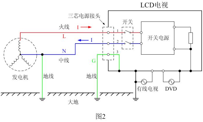 但電流I1沒(méi)有按圖2中的正常路線直接經(jīng)中線返回發(fā)電機(jī),而是經(jīng)地線(1)流入大地,然后電流I1在大地中被分成兩路I2和I5 ,I5直接通過(guò)大地(5)返回發(fā)電機(jī);而I2則通過(guò)大地與電視機(jī)的其它地線(2)(比如有線電視信號(hào)線或與電視機(jī)連接的其它設(shè)備連線)流回到電視機(jī)的外殼一端,I2電流經(jīng)過(guò)有線電視信號(hào)線接口(僅舉其中之一)后變?yōu)殡娏鱅3;I3再經(jīng)電視機(jī)內(nèi)的地線(3)以及電視機(jī)的三芯插頭3號(hào)線接頭,從三芯插頭3號(hào)線接頭流出,流出電流變成I4,電流I4再經(jīng)中線(4)流回發(fā)電機(jī)。