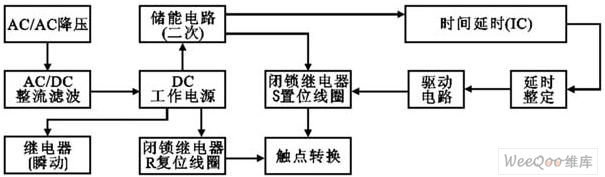 斷電延時繼電器整體構成包括斷電延時繼電器電源部分(經(jīng)降壓、整流、濾波)以提供斷電延時繼電器內置瞬動電磁繼電器和2繞組閉鎖型R復位線圈工作);二次電源部分(供斷電后延時部分與2繞組閉鎖型S置位線圈工作);延時工作部分(可編程定時集成或CMOS計數(shù)分頻集成);驅動部分;執(zhí)行繼電器部分組成(圖1)。