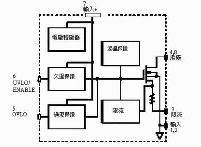 該集成器件包括用戶可選擇的欠壓和過壓保護級,以及一個可調的啟動限流,利用一個電阻就可將電流從最大值向下調。它還集成了一個內部過熱保護電路,從而大大增加了短路和過載情況下該器件的可靠性。