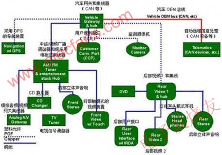 如圖所示,車載網絡的架構可分為內嵌式網絡和用戶便利端口(CCP)。目前的技術規格將內嵌式塑料光纖(POF)車載網絡定義為與現有的MOST(媒體定向系統傳輸)技術相似的規格。但是,前者的架構更加穩固、能夠提供更高的數據傳輸速率,并且更易于實現。這個網絡能夠連接各種電子設備,例如DVD播放機、視頻顯示屏、導航系統、收音機接收設備、通訊設備,如無線電話或應急自動遠程通信及信息處理技術術語,以及其它的多媒體應用。