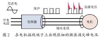 微浪涌電壓是變頻器和電機(jī)之間的接線長度很長時,在電機(jī)接線端產(chǎn)生的極細(xì)的尖峰浪涌電壓。如圖2所示,逆變器的輸出電壓是脈沖狀,在電機(jī)接線端子上發(fā)現(xiàn)在脈沖狀的波形上又疊加了微浪涌電壓尖峰。一般情況下,微浪涌電壓的尖峰值將會是逆變器內(nèi)部的直流電壓的2 倍。