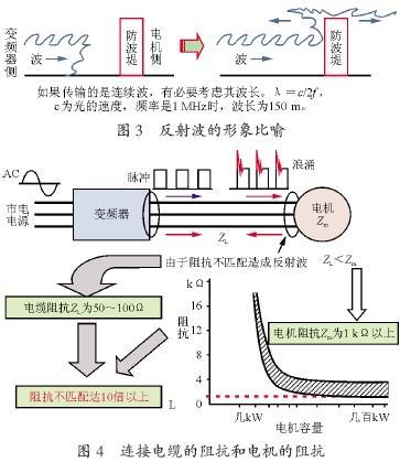 當(dāng)電機(jī)阻抗很大時,反射波與入射波正向疊加,即ZL<ZM時,反射系數(shù)=1。而且,生成與逆變器的輸出脈沖同一極性、幾乎同一大小的反射波,疊加后成為微浪涌尖峰電壓。圖3 形象地表示了反射的情況,微浪涌電壓就像海浪遇到障礙一樣被抬得很高。圖4 表示實(shí)際電纜和電機(jī)的阻抗差別,一般電機(jī)的阻抗是電纜特性阻抗的10 倍以上,所以反射總是存在。