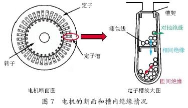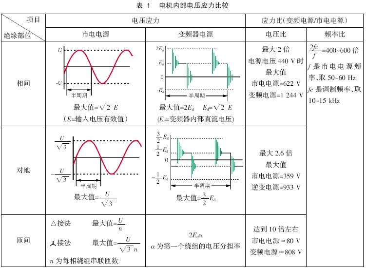 電機(jī)內(nèi)部的斷面如圖7 所示。電機(jī)有定子和轉(zhuǎn)子,定子內(nèi)有安放三相線圈的槽。如果放大槽的內(nèi)部,可以看到有許多的線圈(漆包線),各線圈對地之間、各相之間、線匝相互之間都有絕緣存在。通常對地、相間都有絕緣紙插入,而線匝之間沒有絕緣紙插入,它利用堅(jiān)固的漆包線的漆層獲得絕緣。微浪涌電壓給這些絕緣全部帶來影響,這些絕緣損壞之中,線圈匝間損壞最多。表1 列出了有關(guān)電機(jī)內(nèi)部各絕緣部分承受的電壓值,也稱為電壓應(yīng)力,提供了用市電電源驅(qū)動電機(jī)和用變頻器驅(qū)動時相比較的資料。