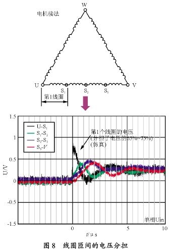 浪涌電壓滲入電機(jī)內(nèi)部的時候,線圈匝間究竟加上多少電壓,模擬結(jié)果如圖8所示。該模擬是將測量點(diǎn)放在電機(jī)的每一線圈上(電機(jī)槽內(nèi)的漆包線圈上),在U-V之間加上上升時間0.14 滋s 的浪涌電壓的測量的結(jié)果。U-S1之間是第1 線圈分擔(dān)的電壓,測得它分擔(dān)了全電壓65豫耀75%,而別的線圈S1-S2、S2-S3、S3-V 之間分擔(dān)了10豫耀20%,這是因?yàn)殡姍C(jī)內(nèi)部的阻抗大,微浪涌電壓在逐漸衰減。
