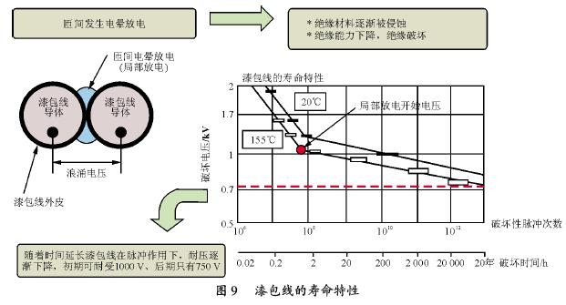 在電機(jī)的制造過程中,漆包線線圈的起頭到末尾完全分離不易做到,多數(shù)情況下是亂繞的,槽里邊線頭和線尾可能緊挨著。如果這樣就會發(fā)生線匝之間由于微浪涌電壓的電暈放電(局部放電)。那怕放電部分時間極其短促,局部也會達(dá)到10 000益,高溫使絕緣逐漸地侵蝕,過些時間之后絕緣就會被破壞。如圖9 所示為直徑0.85 mm、漆皮厚33 滋m、F 級絕緣、155益漆包線的壽命特性。