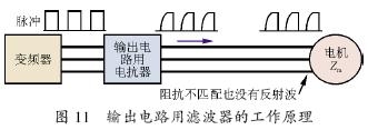輸出濾波器的工作原理如圖11所示。微浪涌電壓是變頻器輸出脈沖上升時間出現(xiàn)的dv/dt 過大所引起,又由于阻抗不匹配被反射而發(fā)生。因此輸出電路使用濾波器,用于抑制dv/dt,也就是抑制了高頻成分因阻抗不匹配而造成的微浪涌。所以輸出濾波器是dv/dt抑制型濾器,這種濾波器在變頻器的調(diào)制頻率為15 kHz、接線長度為400 m時,能做出微浪涌電壓1 000 V以下的性能非常優(yōu)良的產(chǎn)品。不過,這種方式的濾波器為了讓逆變器的輸出電流通過電抗器,不得不做成大容量,造成濾波器的大型化、高價(jià)格化、大重量,有的達(dá)到50 kg以上,給用戶造成了實(shí)際負(fù)擔(dān)。