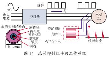 浪涌抑制組件的工作原理如圖14 所示。浪涌抑制組件內(nèi)部卷繞的浪涌抑制線具有和電纜線的阻抗ZL相同的阻抗,因此接到電機(jī)的接線端子上降低了電機(jī)接線端子的阻抗,從而減少了阻抗不匹配時的反射波。通常高頻波成分在電纜線上的阻抗ZL是50耀100 贅,設(shè)計(jì)的浪涌抑制線的阻抗ZS是50~60歐。
