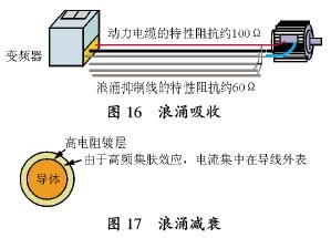 浪涌吸收:浪涌是高頻波成分,低阻抗的浪涌抑制線接在電機(jī)接線端子上,讓浪涌電流流到抑制線里面去,如圖16所示。