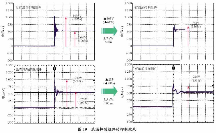 圖19 是變頻器的電源電壓為400 V,3.7 kW的電機(jī)、接線長度50 m,和75 kW的電機(jī)、接線長度100 m時抑制微浪涌電壓的效果。對于3.7 kW的電機(jī),當(dāng)沒有浪涌抑制組件時,微浪涌電壓為1 036 V,相當(dāng)于變頻器內(nèi)部的直流電壓540 V的192%;當(dāng)加了浪涌抑制組件時,50 m電纜的峰值電壓為733 V,相當(dāng)于變頻器內(nèi)部的直流電壓540 V的136%。電壓尖峰差距303 V,有61%的抑制效果。對于75 kW的電機(jī),當(dāng)沒有浪涌抑制組件時,微浪涌電壓為1 040 V,相當(dāng)于變頻器內(nèi)部直流電壓520 V的200%;當(dāng)加了浪涌抑制組件時,電纜的峰值電壓為785 V,相當(dāng)于變頻器內(nèi)部直流電壓520 V得151%。電壓尖峰差距255 V,有49%的抑制效果。