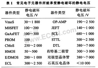(2)靜電釋放(ESD)破壞,造成電子元件不能工作。表1列出了一些常見電子元器件所能承受靜電破壞的靜電電壓,從表中可以看出大部分器件的靜電破壞電壓都在幾百至幾千伏,而在干燥的環境中人活動所產生的靜電可達幾千伏到幾萬伏。圖2是一個CMOS器件和一個雙極型器件在受到ESD損傷后芯片內部的相貌像;
