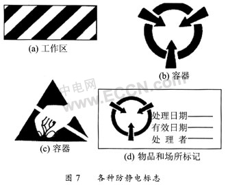 (2)張貼醒目的靜電敏感器件標志,圖7是各種防靜電標志。其中(a)是防靜電工作區的標志,(b)和(c)是防靜電容器、元件架、運輸車等器材上的標記;(d)是經防靜電處理的物品和場所的標記;