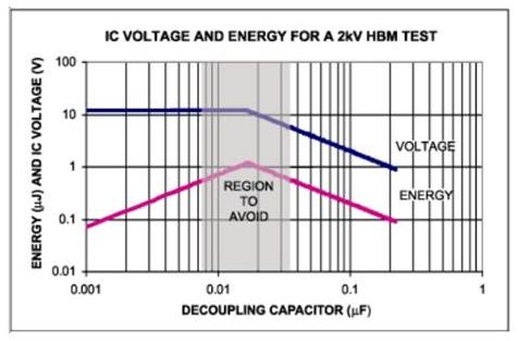 對(duì)于高速雙極型IC,HBM測(cè)試中吸收的最大能量是1μJ;2kV人體模式下,如果電容小于0.02μF(圖 6),C1>>C0二極管會(huì)產(chǎn)生動(dòng)作。為了使去耦電容的能量低于1μJ,去耦電容有兩種選擇:要么容值大于0.05μF,要么小于 0.005μF。當(dāng)使用更高的測(cè)試電壓時(shí),要按比例增大0.05μF電容的尺寸。
