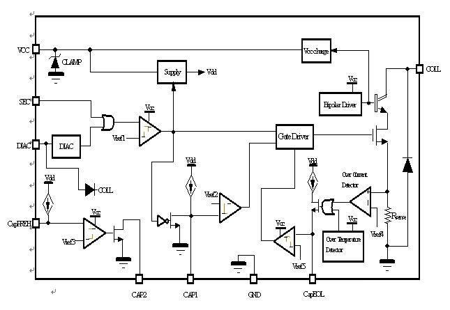 必須從連接二次繞組的SEC引腳觸發、接通這個器件,同時,啟動振蕩電路還需要一個二極管交流開關管的功能。通過SEC引腳,系統可以負載諧振頻率振蕩,同時,通過CAP1、CAP2和CapPREH引腳管理預熱和穩態頻率。特別是,CapPREH引腳上的電容器用于設定預熱時長。