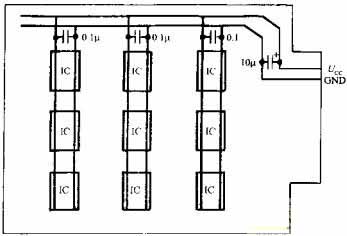 在單片機測控系統中使用了大量的數字IC,而每片數字IC本身都是一個脈沖干擾源,它們也會通過電源線相互干擾。解決辦法是在印制板電源進線端并聯一只10UF~100UF鉭電容進行電源退耦,同時在每個芯片的電源進線端再并聯一只高頻、低分布的電感的陶瓷電容,容量一般取0.1UF,當頻率超過15MHZ時,可取0.01JF,電路如圖所示。退耦電容的引腳要盡量短。