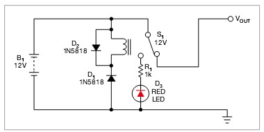 這個方法是用一只繼電器來處理反極性電壓問題。例如,12V供電系統使用12V的繼電器。當為電路施加正確極性時,D1為反偏,繼電器S1保持關閉狀態。則輸入和輸出電源線正常連接到繼電器的端子,電流就流到最終電路上。二極管D1阻擋了繼電器的供電,防止電路耗電。