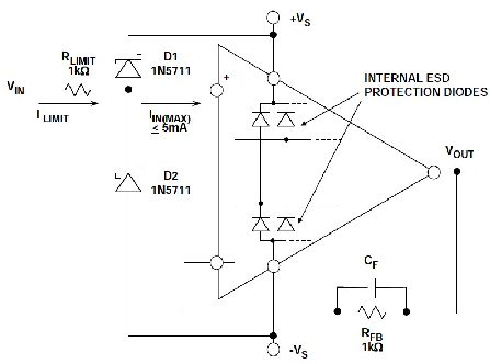 過壓保護還有一點也同樣重要,那就是過大差分電壓引起的過壓。將過大差分電壓施加于某些運算放大器時,可能導致其工作性能降低。