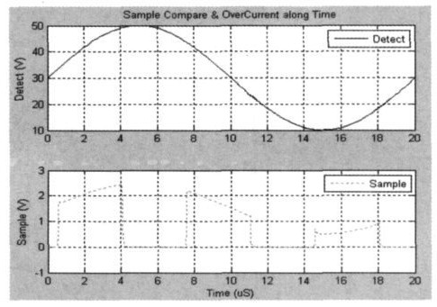 設檢測端電壓一般在10~50 V 之間變化,我們設置V(Detect)=SIN(30,20,50 k);周期為20μS;又設在采樣周期內,比較電壓為1 V;依據LDMOS管導通特性,設輸出漏電壓高于某值(本例為20伏)為過流,則分壓比設計為K = R4/ ( R3+R4)=5 k/(5 k+95 k)=1/20, 于是得到采樣電壓值為V(Sample)=V(Detect)*k =SIN(1.5,1,50 k),即最大值為2.5,最小值為0.5。同樣地,我們在采樣電路輸出端加上一個電容以消除電壓尖峰影響。該采樣電路仿真結果如圖6 所示。