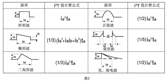 脈沖產生熱循環,從而產生機械疲勞影響保險絲管壽命。設計時應使脈沖I2T遠遠小于保險絲管標稱熔化熱能I2T。保險絲管壽命(可承載的脈沖循環次數)與U(脈沖I2T值之比率)的關系參照表1.本目錄提供的各種規格的保險絲管熔化熱能I2T可供參考,表2提供各種典型脈沖波形的I2T值近似計算公式: