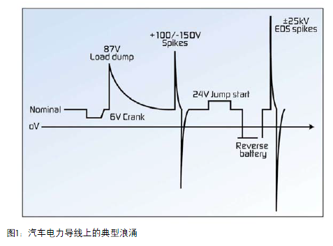 圖1中顯示了最常見的電源軌瞬態(tài)。從嚴(yán)重的低電平-高能量到高電平-低能量的瞬態(tài)變化。特別關(guān)注的是,這些電源系統(tǒng)上得瞬態(tài)變化應(yīng)滿足ISO7637-2和ISO10605標(biāo)準(zhǔn)。