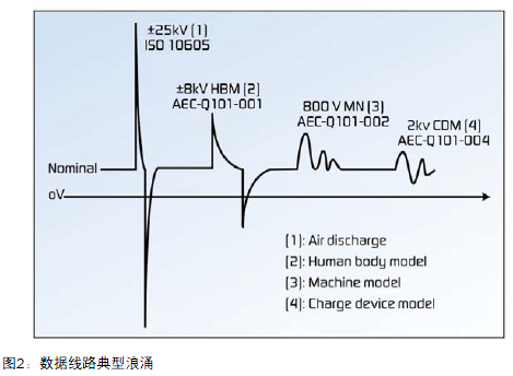 圖2顯示數(shù)據(jù)線路上產(chǎn)生的瞬態(tài)主要是ESD浪涌。盡管此類浪涌為低能量,但是會產(chǎn)生強(qiáng)大的電磁場。