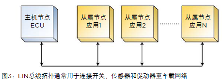 LIN總線拓?fù)淅靡慌_獨(dú)立主機(jī)或ECU(電子控制單元)以及多個節(jié)點(diǎn),如圖3所示。連接應(yīng)用模塊至車載網(wǎng)絡(luò)使其可進(jìn)行診斷和提供服務(wù)。