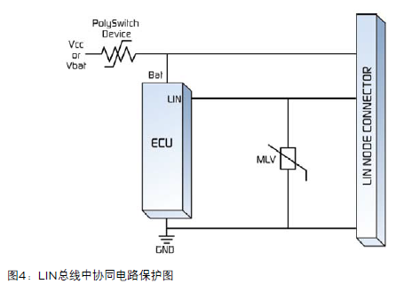 圖4為協(xié)同的電路保護(hù)圖,顯示出一個設(shè)置在功率輸入的可復(fù)位PolySwitch器件如何在電源輸入端保護(hù)ECU和LIN節(jié)點(diǎn)連接器免受過電流情況的損傷,以及一個MLV(多層電壓敏電阻器)如何為車載網(wǎng)絡(luò)應(yīng)用提供所需的高電流處理和能量吸收的過電壓保護(hù)。