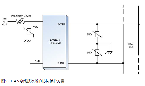 圖5顯示了如何在電源輸入端應(yīng)用可復(fù)位PolySwitch設(shè)備和MOV(金屬氧化電壓敏電阻器)從而避免因車載供電系統(tǒng)中心的浪涌電流和電壓異常而產(chǎn)生的損傷。