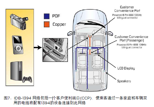 IDB-1394車載結(jié)構(gòu)可分為內(nèi)置網(wǎng)絡(luò)和客戶便利端口,簡稱CCP,如圖7所示。該標(biāo)準(zhǔn)顯示了一種類似于現(xiàn)有MOST標(biāo)準(zhǔn)的一種內(nèi)置塑料光纖(POF)車載網(wǎng)絡(luò)。然后,該網(wǎng)絡(luò)更加穩(wěn)固且更易使用。多種電子元件可以連接到此網(wǎng)絡(luò),如DVD播放器、視屏顯示器、導(dǎo)航系統(tǒng)、無線電主機(jī)以及通訊設(shè)備。