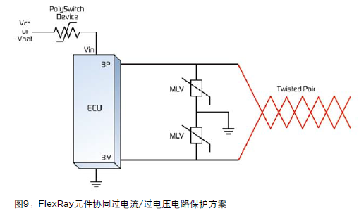 FlexRay協(xié)議專為線控應(yīng)用所設(shè)計(jì),如線控剎車和線控方向盤。該線控網(wǎng)絡(luò)方式支持同步和異步數(shù)據(jù)傳輸,數(shù)據(jù)傳輸率約為10Mb/s,具有時間觸發(fā)和事件觸發(fā)行為、冗位和容錯的特點(diǎn)。該結(jié)構(gòu)支持一“束”2個節(jié)點(diǎn)至64個節(jié)點(diǎn),其功能主要依靠于兩種類型的處理器—ECU和“活動星”。FlexRay通訊通過一個常用總線或一個星形連接在ECU之間進(jìn)行。FlexRay元件的總線輸入必須避免在總線路和系統(tǒng)供電電壓或地電位之間出現(xiàn)短路現(xiàn)象。圖9顯示了ECU的調(diào)整后過電流/過電壓保護(hù)方案。該方案利用一個PolySwitch設(shè)備進(jìn)行過電流保護(hù),以及兩個傳統(tǒng)表面安裝結(jié)構(gòu)的MLV進(jìn)行ESD和瞬間過電壓保護(hù)。