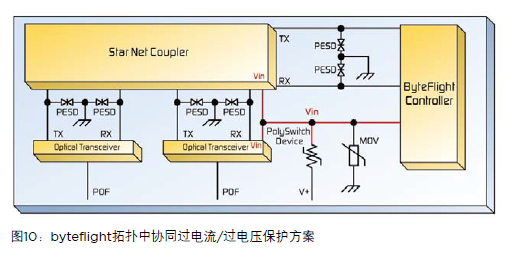 byteflight協(xié)議是一個車載數(shù)據(jù)總線,為提供車載元件之間進(jìn)行非常安全且容錯的電子通訊手段而開發(fā)。byteflight在總線、星形或集群配置中通過2線或3線塑料光纖(POF)達(dá)到10Mbps以上的速度。該系統(tǒng)結(jié)構(gòu)中使用POF使其功能能夠在數(shù)據(jù)方面達(dá)到電氣上的獨(dú)立。然而,節(jié)點(diǎn)仍然從車載供電總線處獲得電流,而且會受到電磁干擾的影響。構(gòu)成該網(wǎng)絡(luò)的元件,如微處理器、byteflight控制器和光收發(fā)器,容易因供電尖峰和反向電壓而受到損傷。集成電路(ICs)或許包括ESD保護(hù),但是通常限制在2kV以下。如圖10所示,PolySwitch設(shè)備和MLV可以保護(hù)這些模塊不受高能量過電壓和過電流瞬態(tài)的影響而產(chǎn)生損傷。