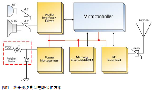 藍(lán)牙標(biāo)準(zhǔn)雖然最初并非為車載環(huán)境而設(shè)計(jì),但已經(jīng)為車輛和其系統(tǒng)之間進(jìn)行溝通的移動電子設(shè)備創(chuàng)造了新的市場前景,如手機(jī)、MP3播放器和導(dǎo)航設(shè)備。保護(hù)暴露在外的通訊界面不受因天線和儀器無線(RF)界面所產(chǎn)生的ESD和其他電壓浪涌的影響是一個相當(dāng)重要的設(shè)計(jì)問題。圖2顯示了一個PolyZen集成過電流/過電壓設(shè)備如何幫助保護(hù)藍(lán)牙模塊的功率輸入。MOV或表面安裝的MLV也可用于避免車載麥克風(fēng)和擴(kuò)音器界面上出現(xiàn)電壓瞬態(tài)。PESD設(shè)備可以用于避免電線出現(xiàn)ESD浪涌。