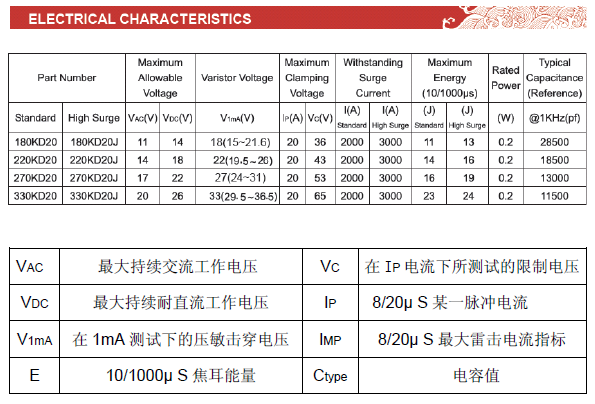 • 電壓規格從18V~1800V,突波耐電流能力從幾百安培到幾十千安培不等,單體最大可達70KA