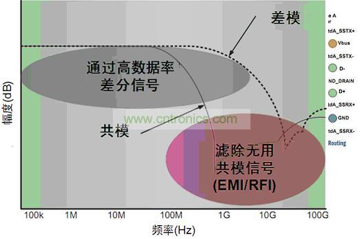 這些應(yīng)用中能使用共模濾波器(CMF)來消除不想要的共模噪聲,并防止高速信號輻射有害的共模噪聲信號至系統(tǒng)其它元件。同時,CMF還使想要的高速數(shù)據(jù)事實上不受影響地通過。典型的CMF特性如圖4所示,圖中顯示消除了共模噪聲,同時支持差模信號無損通過。