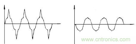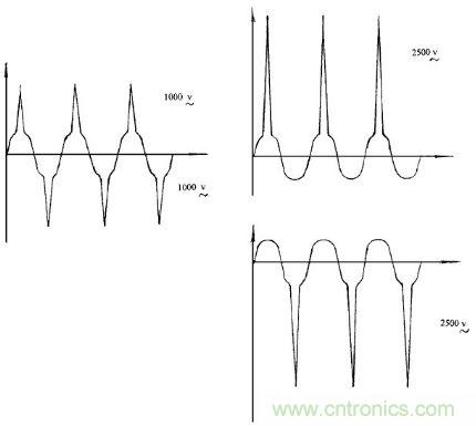 圖4中在開啟或關閉帶有感性, 容性的負載電路時, 直流波形出現開關尖脈沖, 壓敏電阻將吸收這種反電動勢, 有效地保護開關電路、變電壓。